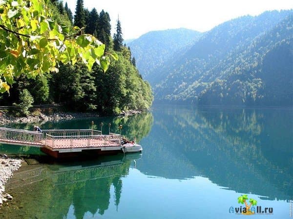 Но лишь поднявшись в горы, туристы сполна ощутят все величие и красоту местной природы. Одна из самых незабываемых достопримечательностей Абхазии — озеро Рица. Расположено оно среди горных хребтов, густо заросших лесами, на высоте в 1000 метров. Путь к нему начинается от Голубого озера и проходит по головокружительному серпантину, вдоль которого расположено несколько смотровых площадок.