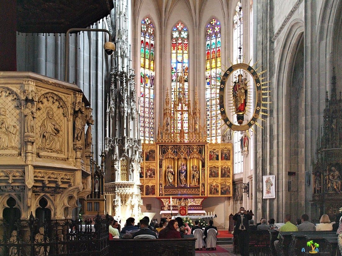 Над нефом находятся святые Августин, Иероним, Амвросий и Григорий, окруженные полями с растительным орнаментом. Простой хор на западной стороне нефа поддерживается двумя колоннами с профилированными головами. Среди церковных принадлежностей есть поздние барочные алтари с 1-й половины XVIII века в окружении готических и барочных скульптур на консолях.