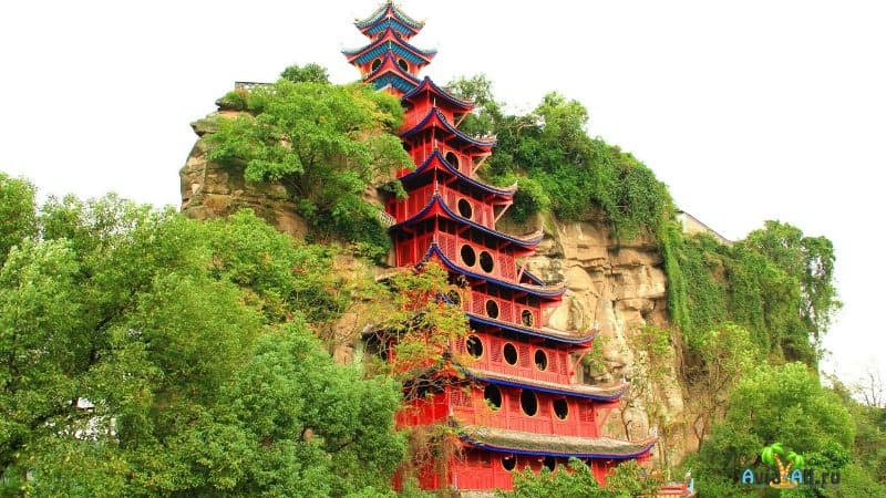 Шибаочжай в Китае — это пагода канонической формы. На фоне густой зелени храм выделяется красным цветом. Выглядит храм так, будто он просто врос в гору. Под ним расположено здание, в котором можно приобрести сувениры и фигурки ручной работы. На самом верху постройки открывается великолепный вид на горы.