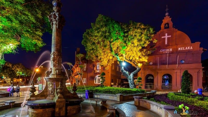 Передвигаться по городу можно на такси, велорикше или пешком. В центре Малакки расположился Датч-сквер. На этой площади находится церковь Христа. Она была построена голландцами в 1753г. Храм – небольшой и очень красивый. Вокруг него разбиты газоны с яркими цветами, а в центре площади расположен фонтан «Королева Виктория». Туристам предоставляется возможность осмотреть церковь не только снаружи, но и изнутри, где можно присесть на деревянные лавочки ручной работы (они сохранились с момента постройки), полюбоваться алтарем.