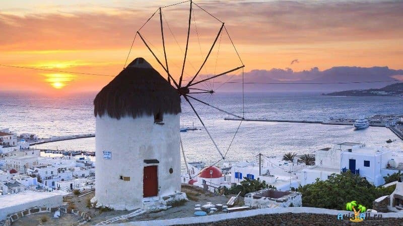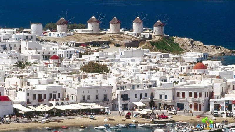 На юго-востоке столицы острова Хоры располагаются ветряные мельницы, ставшие визитной карточкой Миконоса.