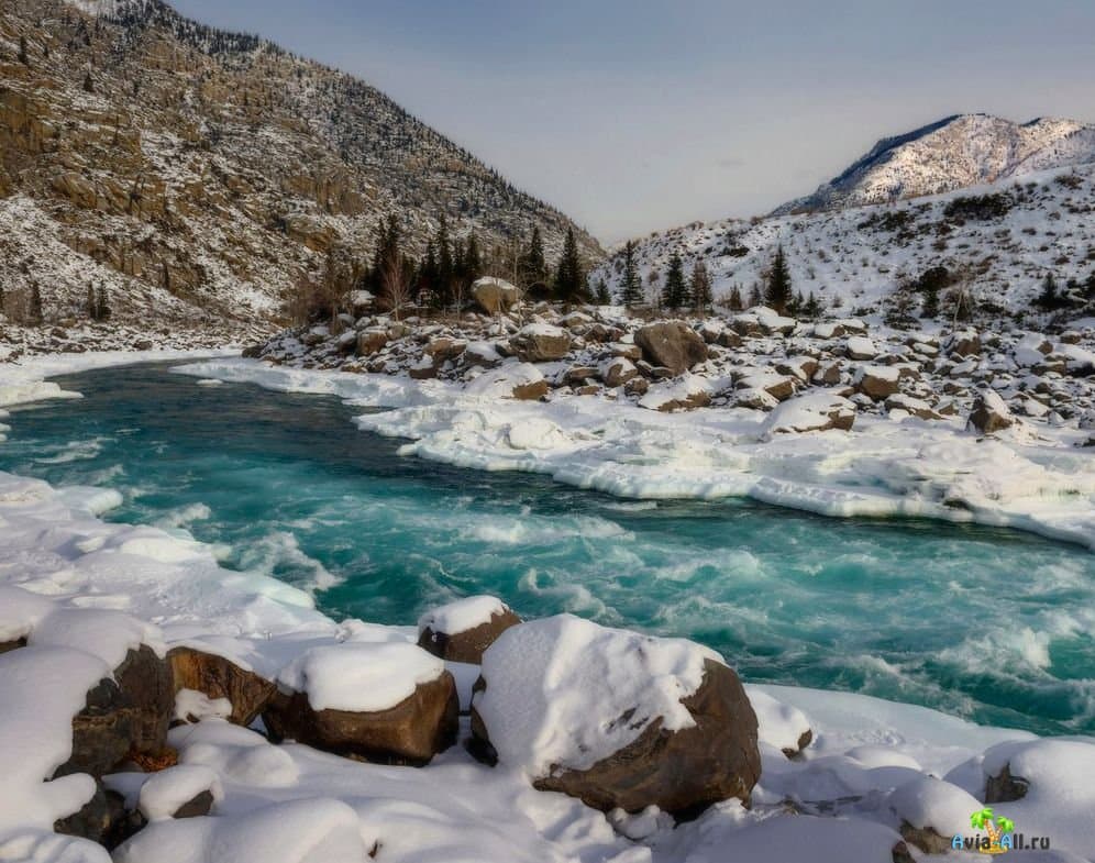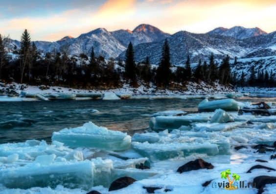 Красивые фотографии зимой получаются у горных рек Чуя и Катунь, по которым плывут льдины, снесенные сильным потоком воды.