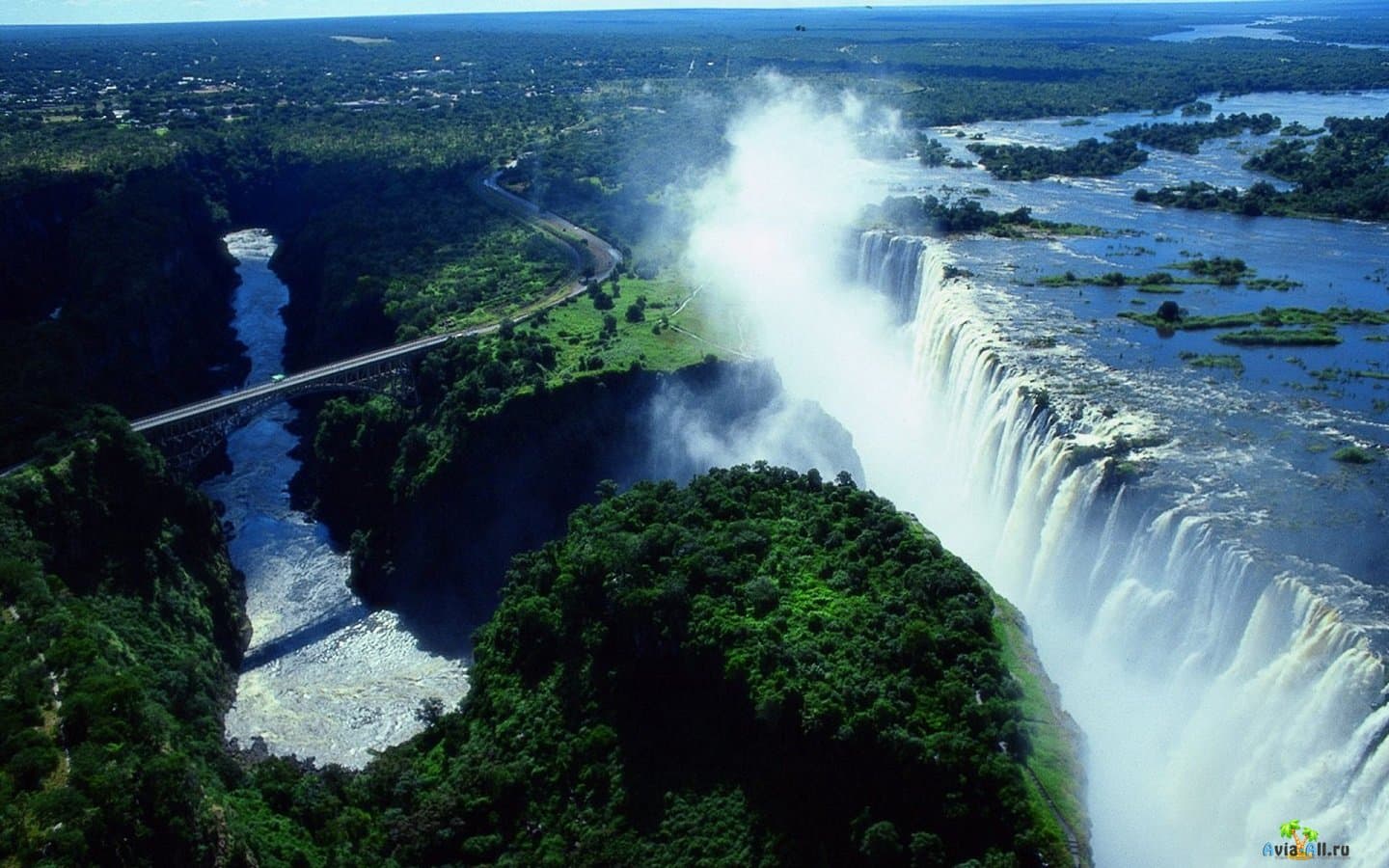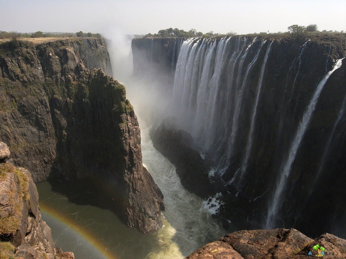 Находящийся в Южной Африке водопад Виктория, можно без преувеличения назвать одной из жемчужин африканского континента. Он входит в список Семи чудес света природы. Водопад расположен на четвертой по величине реке Африки, которая, в свою очередь, протекает по границе стран Замбия и Зимбабве, бывших во времена английского владычества единым государством под названием Родезия.