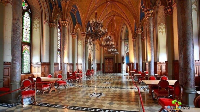 Замок Нойшванштайн внутри выполнен в разных стилях. Смешение стилей и разных эпох, как ни странно, выглядит гармонично. Названия залов дворца происходит от легенд – Тронный зал, Зал певцов. Всего в замке 360 залов, и все посвящены героям произведений Рихарда Вагнера.